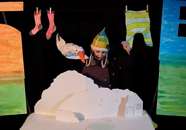 Told with one performer, beautifully illustrated paper puppets, and a giant pop-up book, The Goose and Mrs Frost draws from folk traditions to tell a gentle, magical story about the seasons, intergenerational friendship, and the quiet power of kindness.